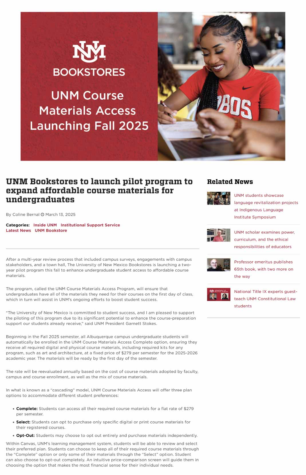 Introduced in 2025 after more than a year of development, Course Materials Access is UNM’s new model for delivering required course materials to undergraduates. Affecting more than 20,000 students and dozens of academic units, the program required a clear, unified communication plan to ensure transparency and understanding across campus. I led the full communication and marketing strategy for this rollout, building the program’s identity, developing all messaging and visual assets, managing the website, and coordinating outreach across campus partners.
